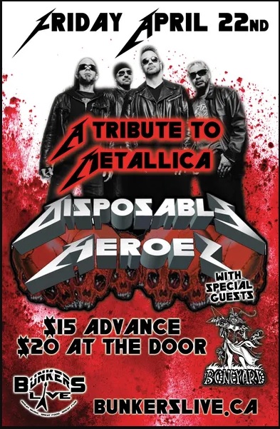 Hello, friends!!! It's been waaaaaay too long! Disposable Heroes are very pleased to announce that we will once again be hitting the stage for shows in April of 22. The first show will be April 22nd at The Bunker in Edmonton, Alberta. The second show will be the following night in Drayton Valley, Alberta at the Max Center. More shows are in the process of being put together so stay tuned!